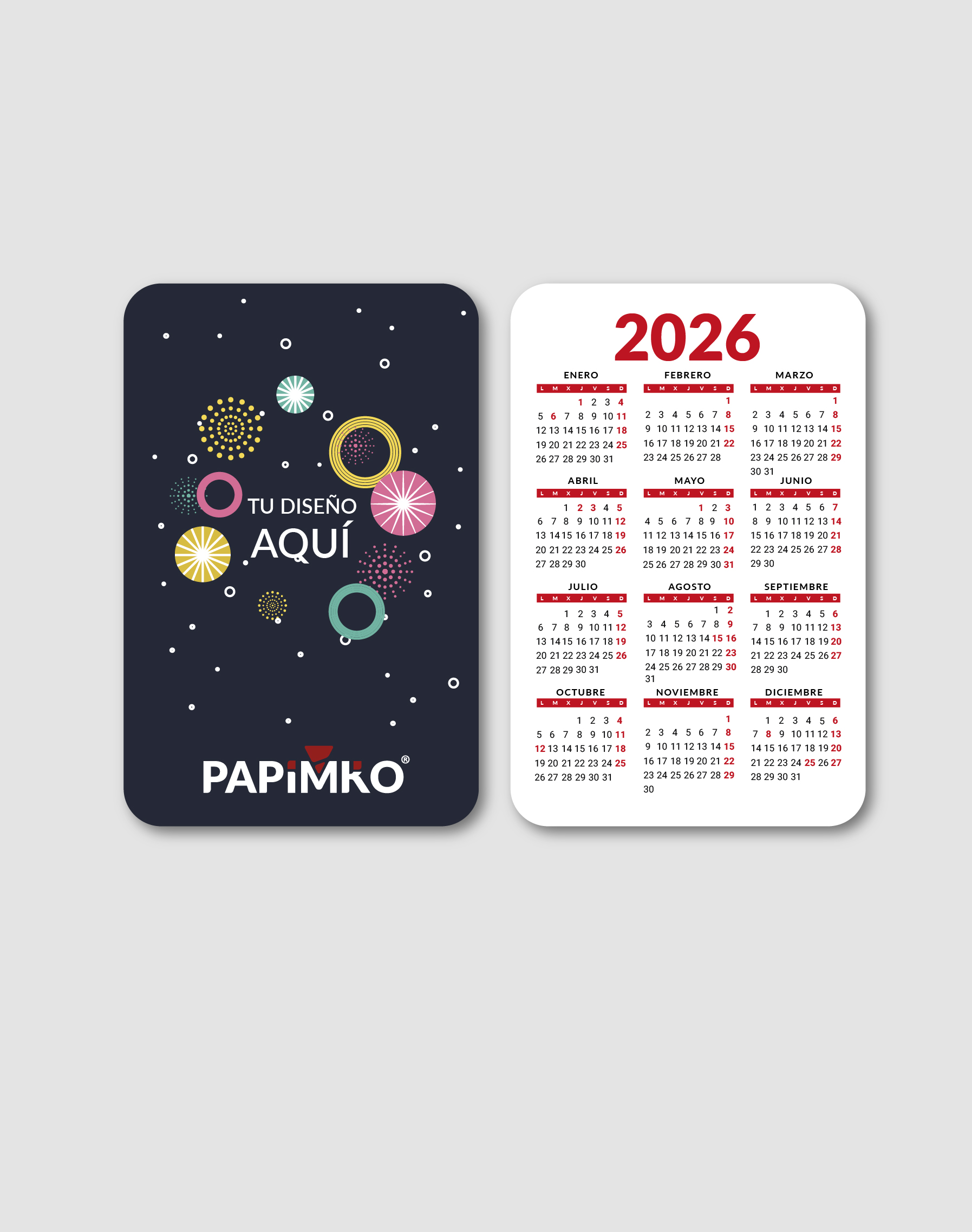 Calendario de mano personalizado. Escoge entre nuestro modelos. El calendario de bolsillo tiene un tamaño de 10 x 6,5 cm perfecto para llevar siempre en la cartera. Es ideal para merchandising en empresas como propaganda publicitaria de tu negocio de una forma económica, ya que hacemos precio por cantidad.