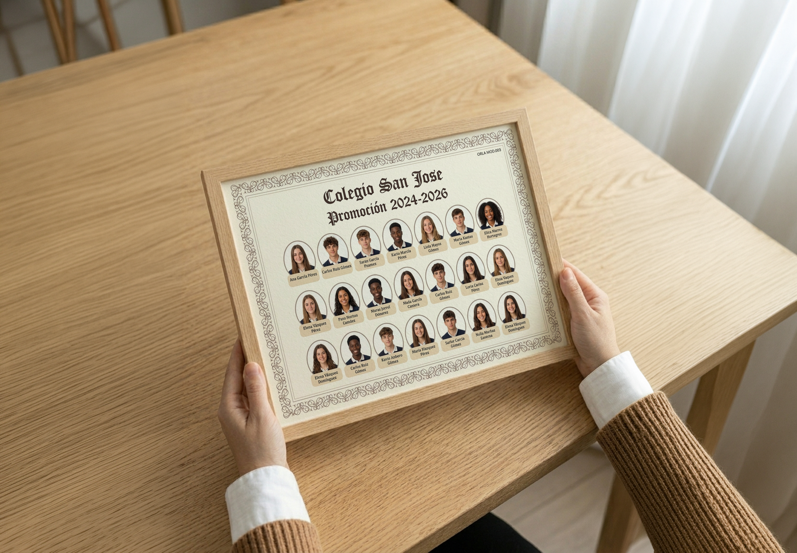 Si todavía no tienes diseño, puedes seleccionar uno de nuestros modelos de orlas profesionales. Nuestro equipo adaptará el diseño con las fotos, nombres y datos de tu promoción.